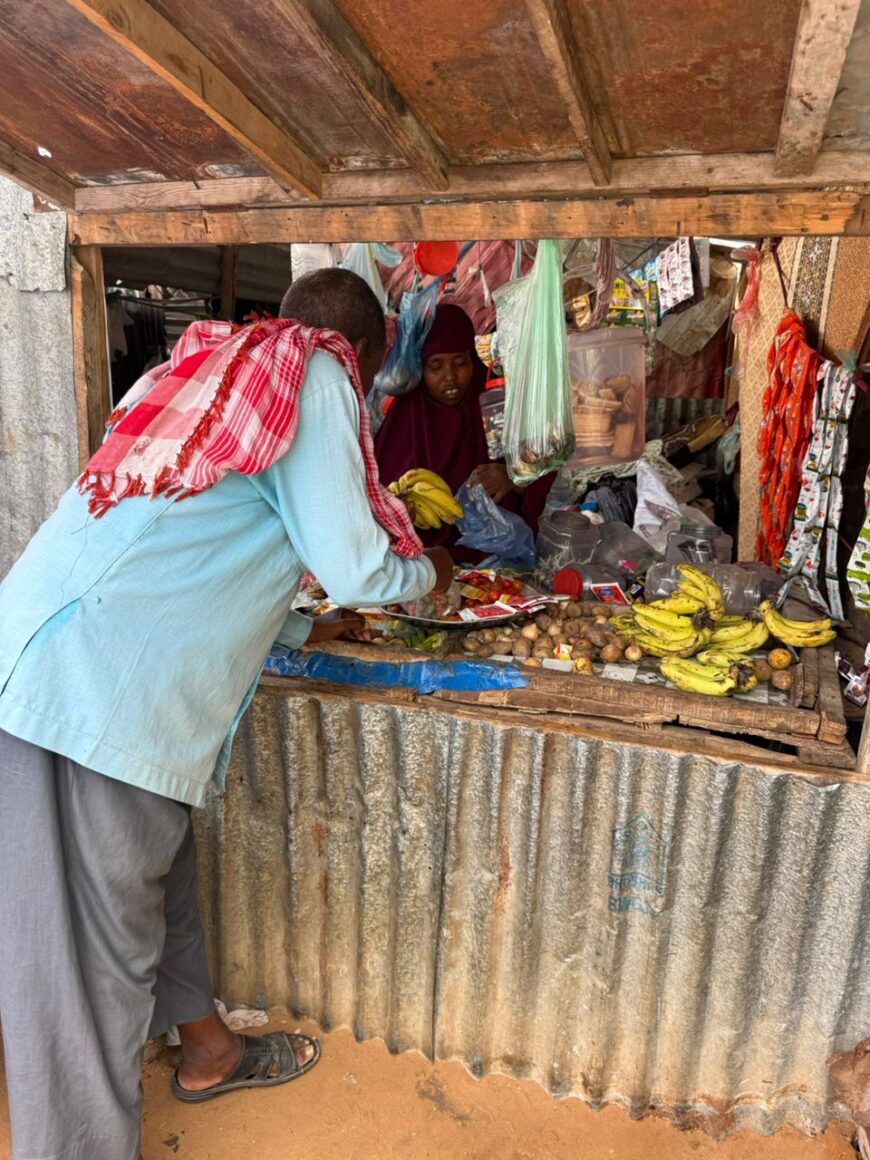 Fariah traveled to nearby Afgoye markets to buy affordable, high-demand items such as fresh vegetables, onions, tomatoes, cooking essentials, and basic household goods like soap, sugar, and detergents. These items were difficult for displaced families to access due to long distances, high transport costs, and insecurity. Back in the camp, she built a modest kiosk beside her shelter using wooden poles and plastic sheeting. It quickly became one of the few functioning shops in that section of the settlement, attracting neighbors—especially mothers and elderly residents—who valued the convenience.